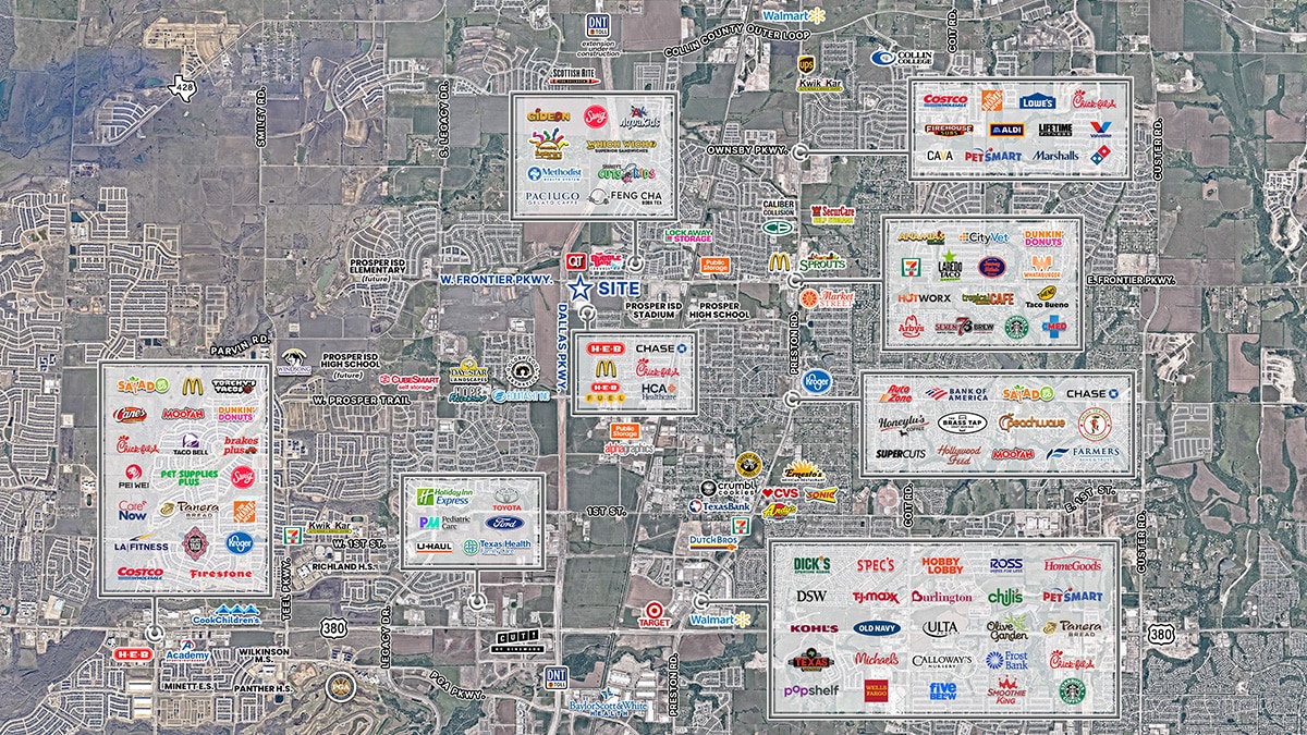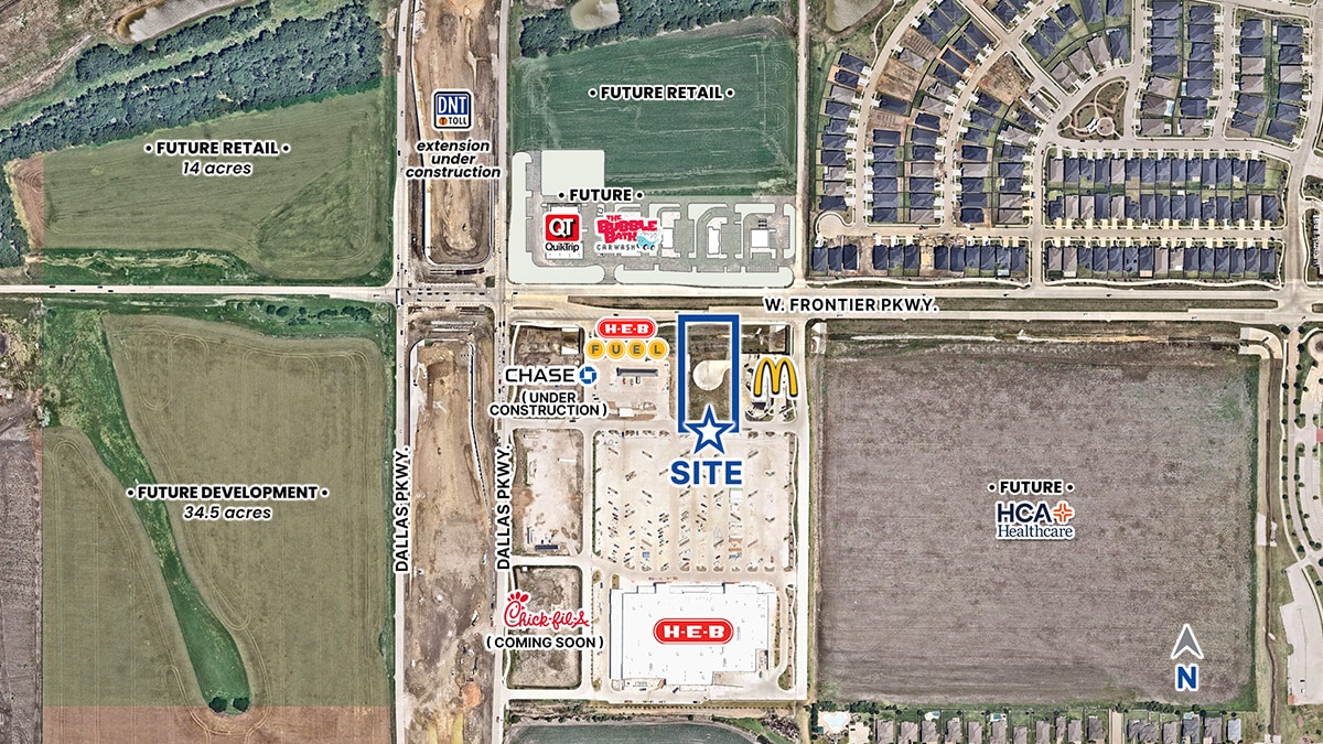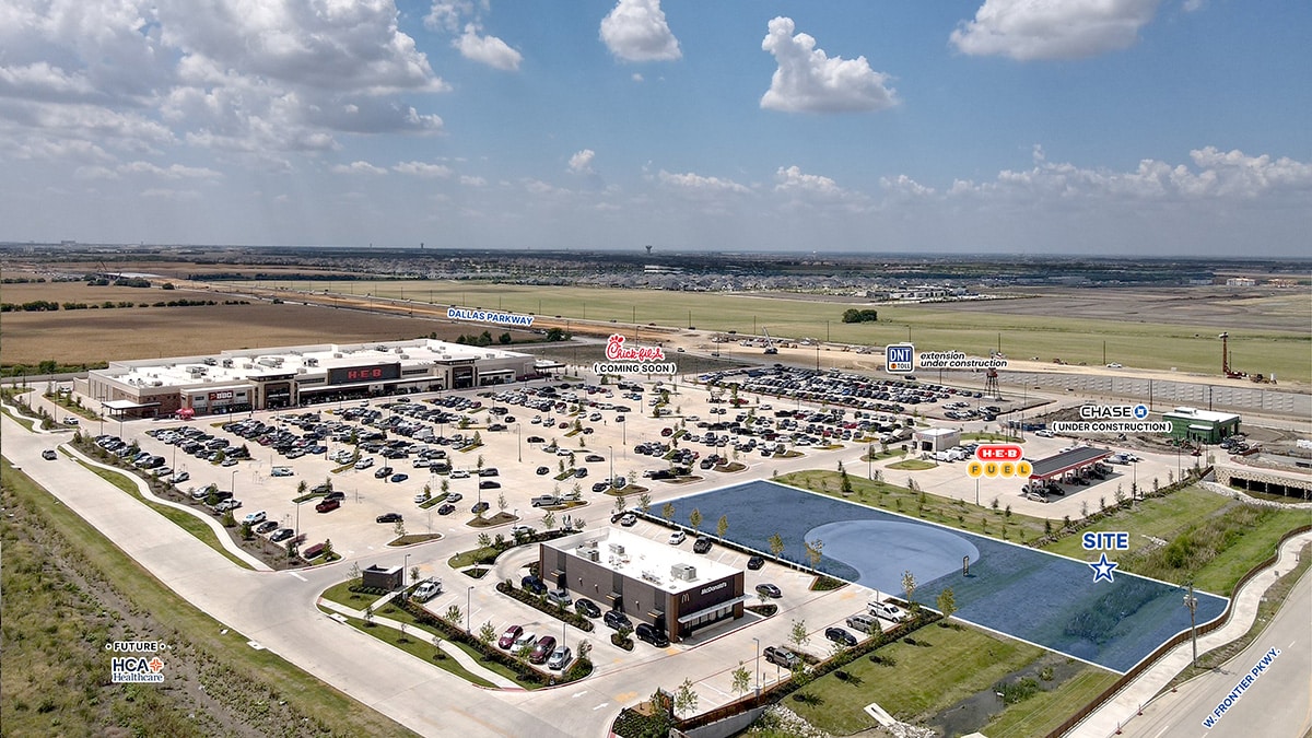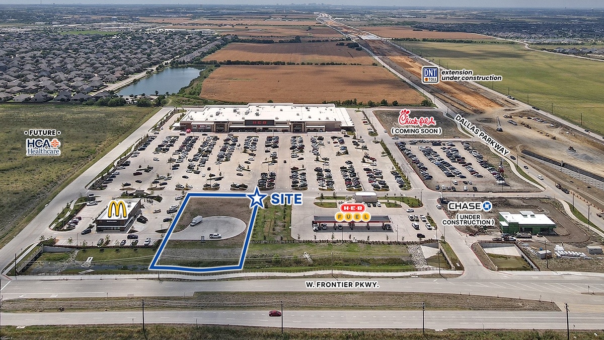 Superb retail development pad site available for lease or build-to-suit on the southeast quadrant of W. Frontier Pkwy. and Dallas Pkwy. in Prosper, a fast growing, affluent suburb in North Texas. Shadow anchored by HEB, the property enjoys high visibility with prime frontage and convenient ingress and egress. In addition, the site is easily accessible from the Dallas North Tollway, Preston Rd., and Hwy 380 and benefits from its strategic position along the highly-trafficked Frontier Parkway, a major east-west corridor connecting Prosper to neighboring cities like Celina and Aubrey. In addition to HEB, many other national retailers and businesses currently have planned locations in the immediate area such as Chase, Chick-fil-A, Quiktrip, and HCA.